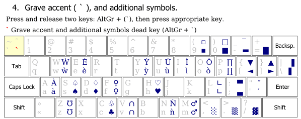KbdKaz 500 looks like to be more powerful and versatile (and in some respects more intuitive) than the US-International keyboard, but I have to work on other people’s computers fairly often. And, besides — after switching from QWERTY TO AZERTY and back to QWERTY, and then learning character substitutions to use a French daisy-wheel printhead on a US DOS system, and then learning extended ASCII codes by heart for manual inputting, and then writing Word for DOS macros to enter them more quickly, and then finally learning the US-International keyboard, I’m tired of learning curves and unusual customizations for something as basic as data input. I’m sure KbdKaz 500 is great for someone who needs ready access to more unusual special characters than I do and who only works on his own computers, but I’m giving it a pass…