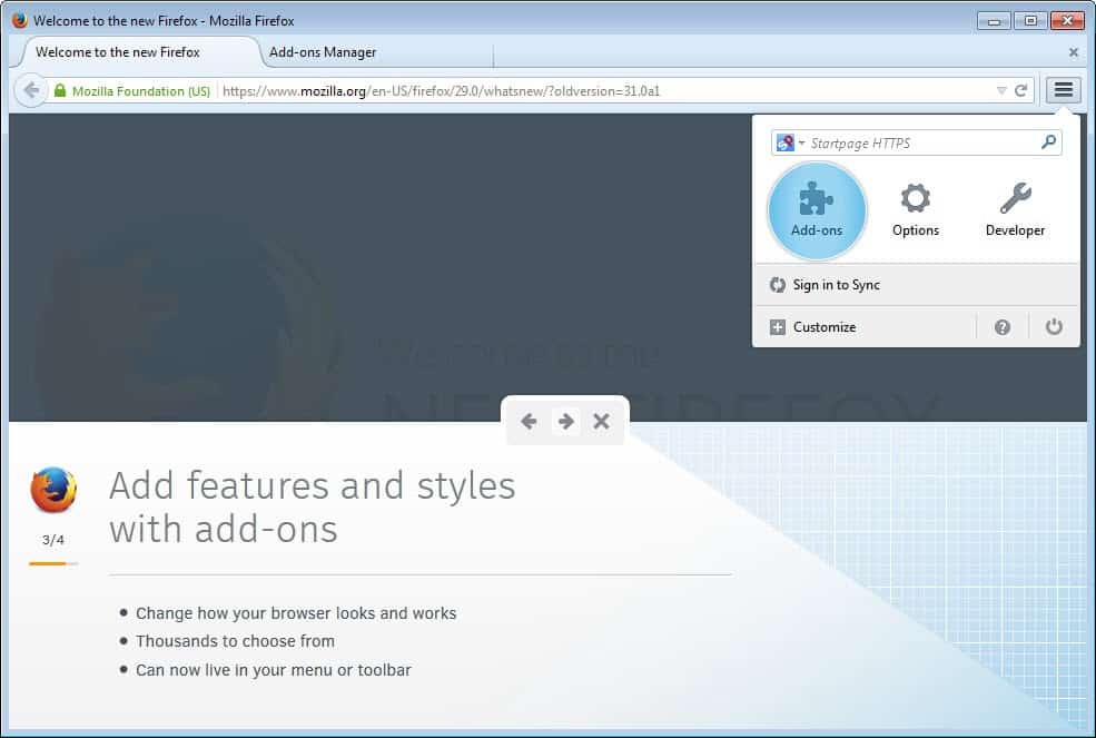 Firefox 29 features a major interface rebuild that Mozilla named Australis internally. A tutorial is displayed on first start to users who upgrade to Firefox 29 which aims to highlight the major changes of the new interface to users to make adaption easier.