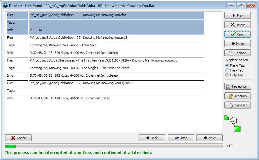 The manual process displays one source file and all of its duplicate files in each step. You can play any file found here to verify the findings this way, select to keep, move, replace or delete files, open the tag editor, the directory of the source file, or copy the findings to the clipboard.
