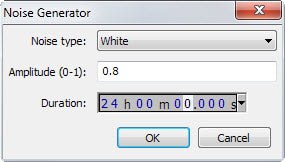 This opens a small overlay window that you use to generate the white noise audio file. Select the desired duration -- the default is 30 seconds -- and hit the ok button afterwards.