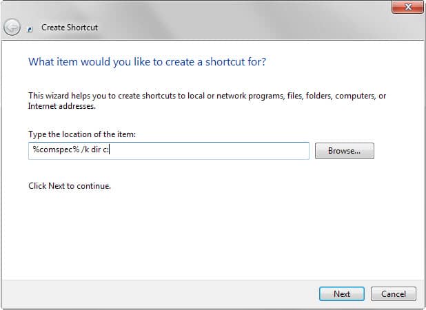 Type the command that you want executed whenever you run the shortcut, for instance %comspec% /k dir c: or any other command in that format.
