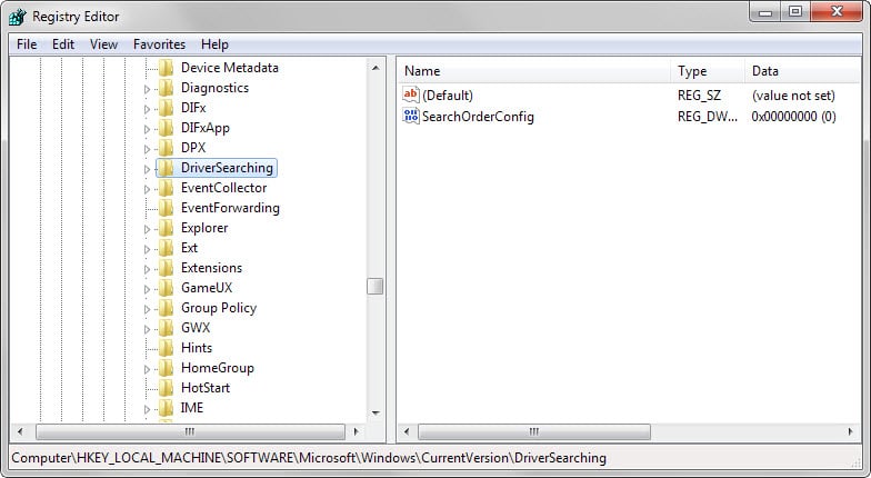 - Navigate to the key HKEY_LOCAL_MACHINE\SOFTWARE\Microsoft\Windows\CurrentVersion\DriverSearching