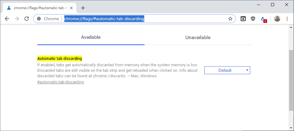 - Open chrome://flags/#automatic-tab-discarding in the browser's address bar to focus the Automatic Tab Discarding experiment.