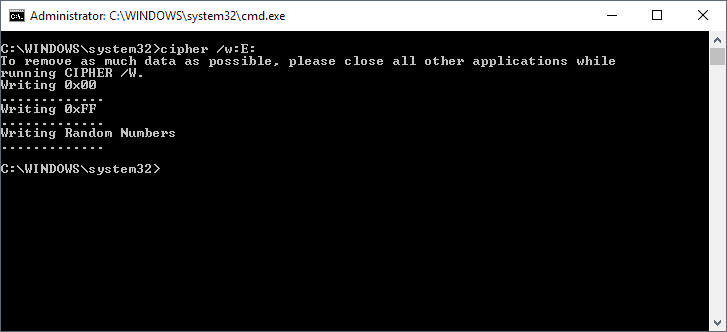 Cipher's /w option commands the tool to wipe the location. The tool has three passes: 1) replace all data with 1's, 2) replace all data with 0's, 3) replace all data with random numbers.