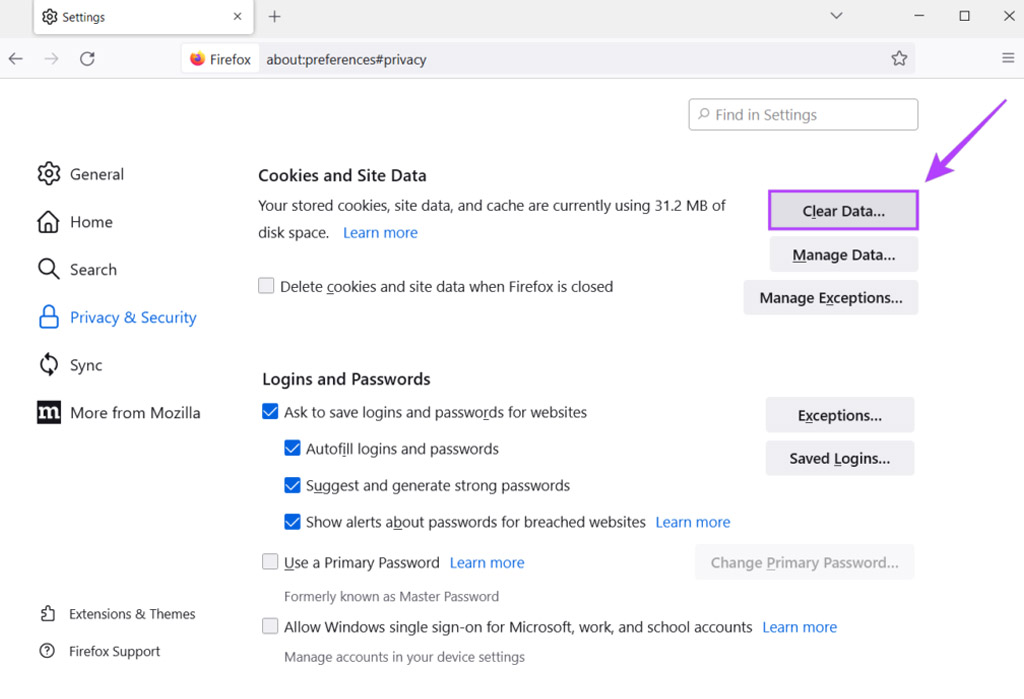 Just head to the same main menu and click on Settings. From there, go to Privacy and Security and click on Clear Data. You can also choose what type of data you want to clear. When you restart Firefox, websites will initially be slow to open until sufficient data is stored again.