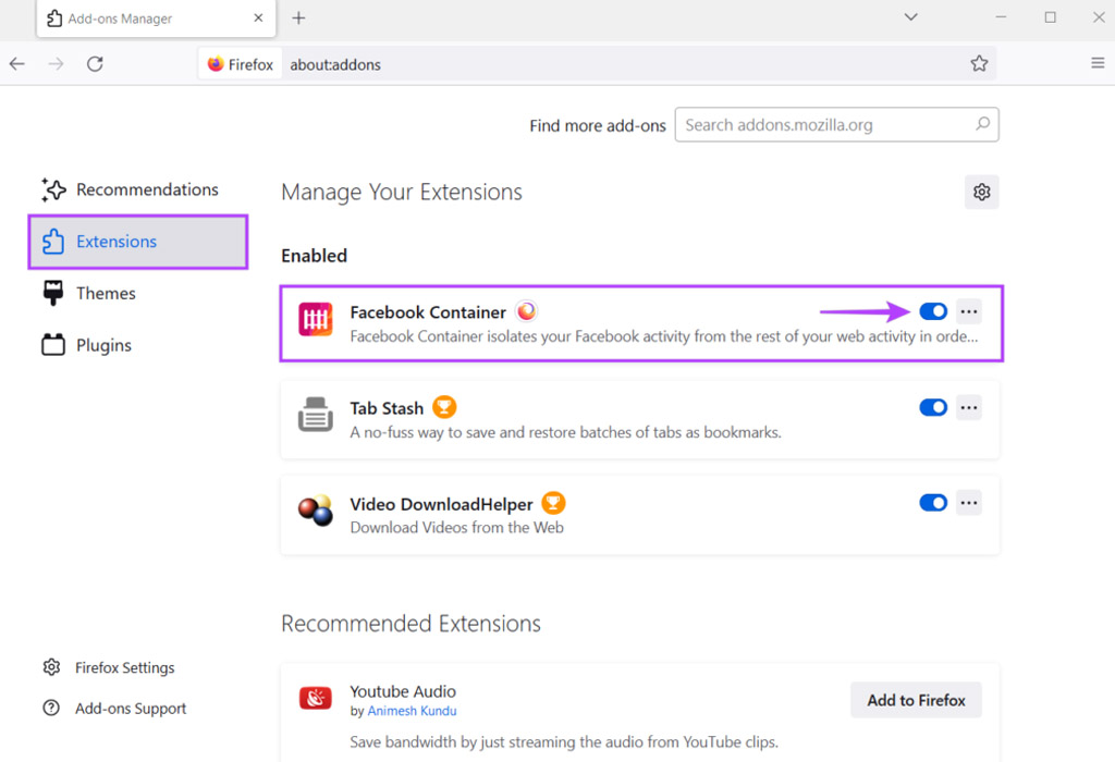 To get rid of a few Firefox extensions, head back into that main menu and go to Add-ons and Themes. Here, you can quickly see which ones are active and disable the ones you don’t really need. Feel free to even remove them altogether to see if that helps with performance.